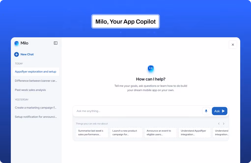 Milo (AI CoPilot) that delivers performance insights, marketing suggestions, and growth recommendations based on your app data.