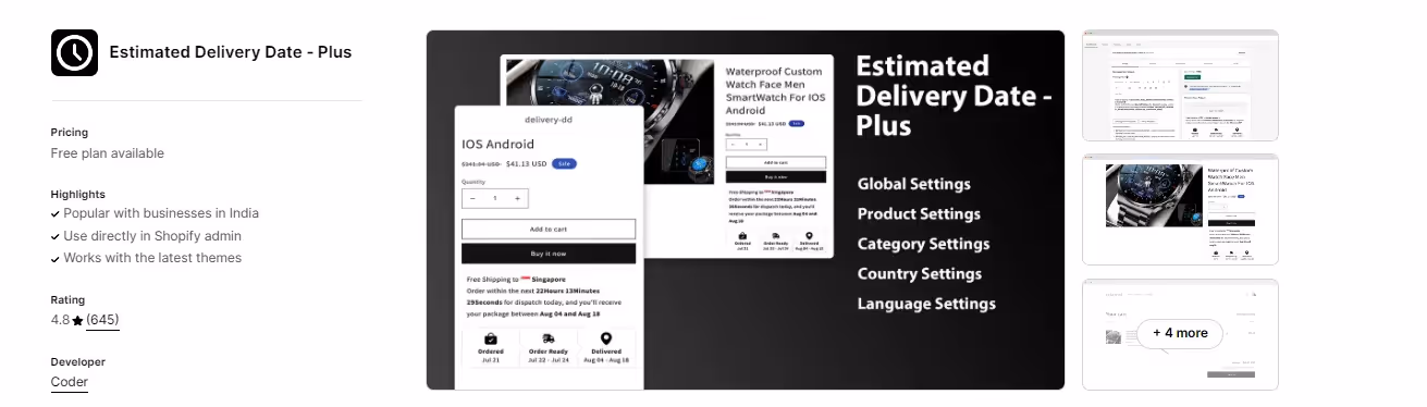 With multi-language and country support and visitor time zone calculations, the app delivers accurate delivery date displays globally, encouraging customers to complete their purchases.