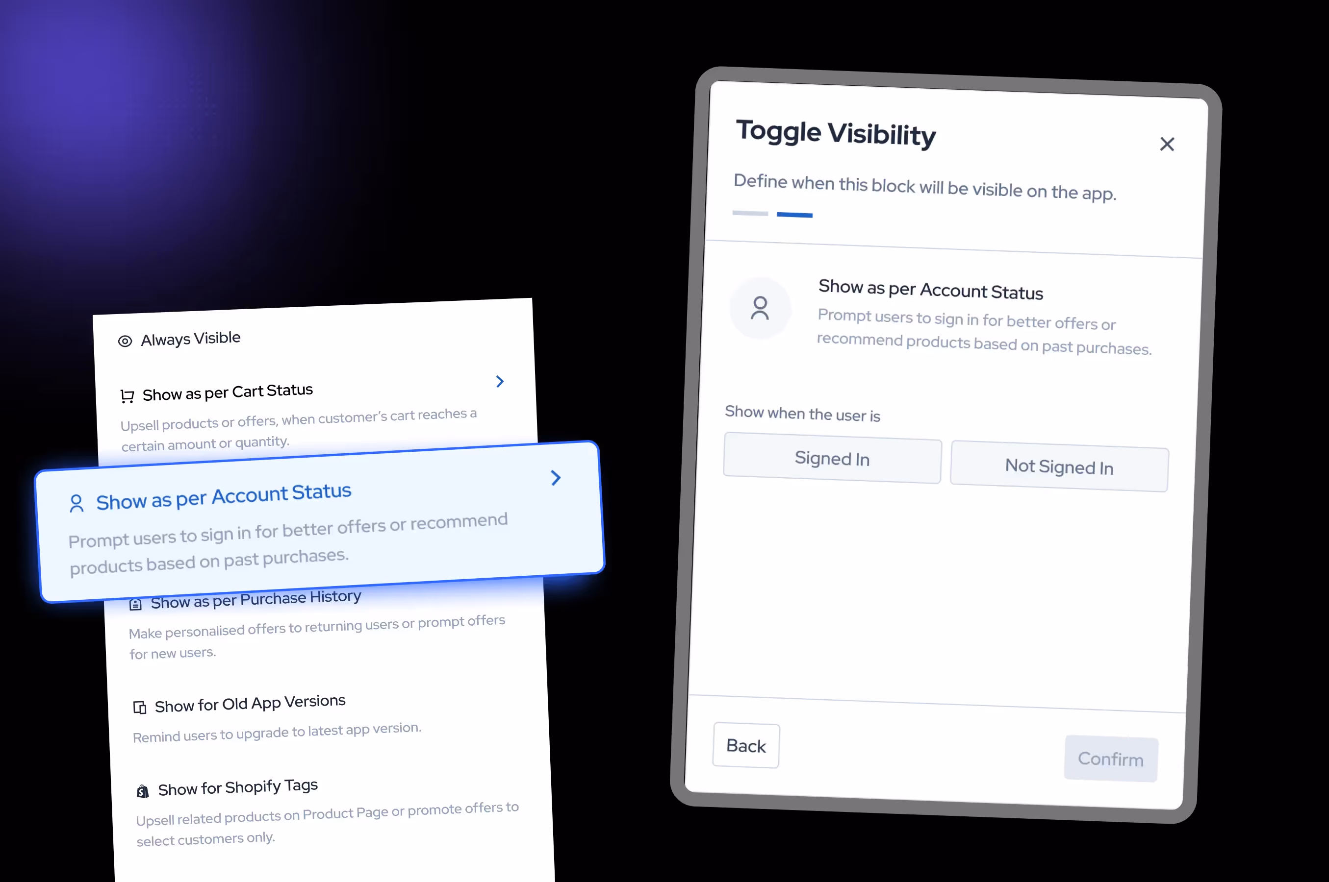 80% of consumers prefer personalized experiences, and 91% are likelier to buy from brands with relevant recommendations. This opens up huge opportunities to increase AoV, conversions, and customer satisfaction. By using features like targeted visibility based on cart value, purchase history, and user status, your brand can improve conversion rates and order values.