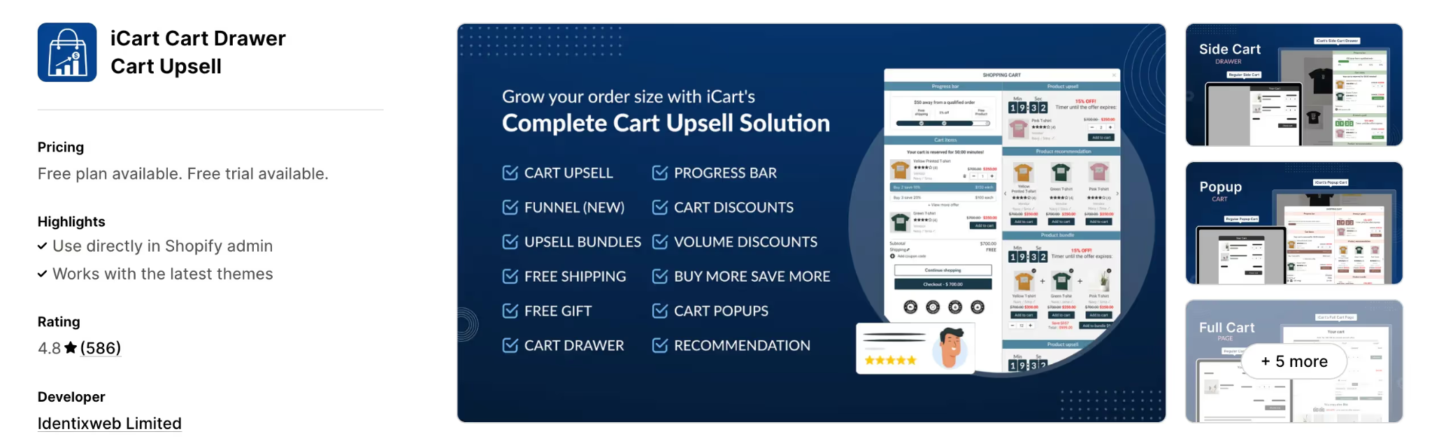 iCart is an all-in-one cart drawer and full-cart builder that adds upsells, cross-sells, bundles, discounts, progress bars, and countdown timers before checkout. It is designed to turn the cart drawer into a mini sales funnel with AI-powered product recommendations and multi-tier incentives.
