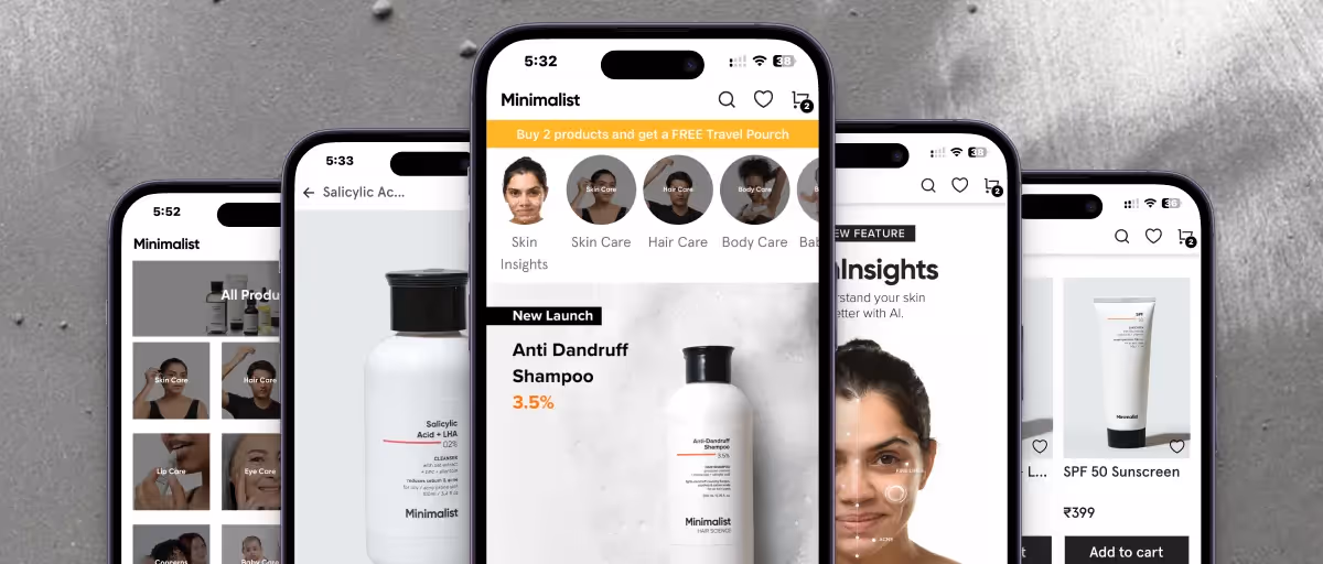 Minimalist sells directly to consumers online. It builds loyalty through social media awareness, keeping the brand ahead in India’s growing beauty market. However, Minimalist struggled with their previous app builder. Now, as the brand plans to expand into haircare and body care, and also explore AI skin analysis for personalized skincare recommendations, they needed a reliable app partner.