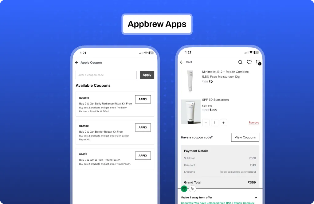 Appbrew's promotion engine works intelligently throughout the shopping journey. Customers see relevant discounts on product pages, receive cart goal prompts during checkout, and get personalized offers based on their shopping behavior and loyalty status.