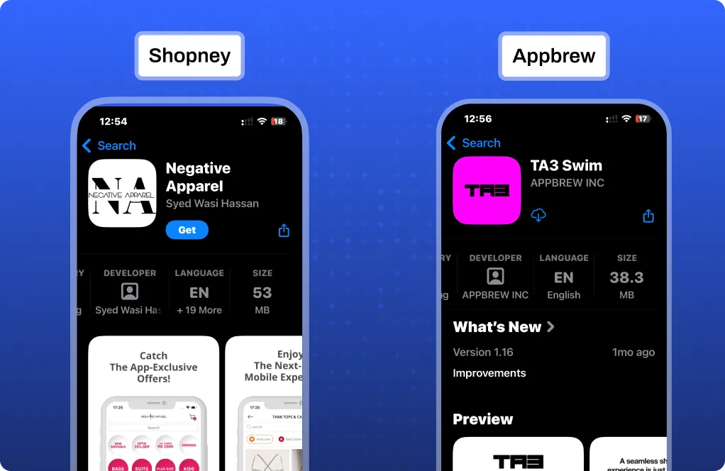 Both Shopney and Appbrew build native mobile apps, but Appbrew's optimized framework delivers superior performance and scalability for enterprise brands.