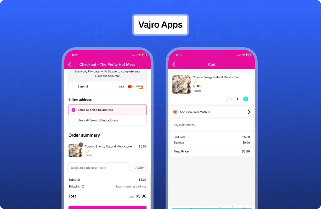 In contrast, Vajro allows you to design homepage layouts and product listing pages with the drag and drop editor, the actual shopping experience, especially checkout, and post purchase experience is constrained by the limitations of web browser rendering, resulting in a clunky and poor user experience.