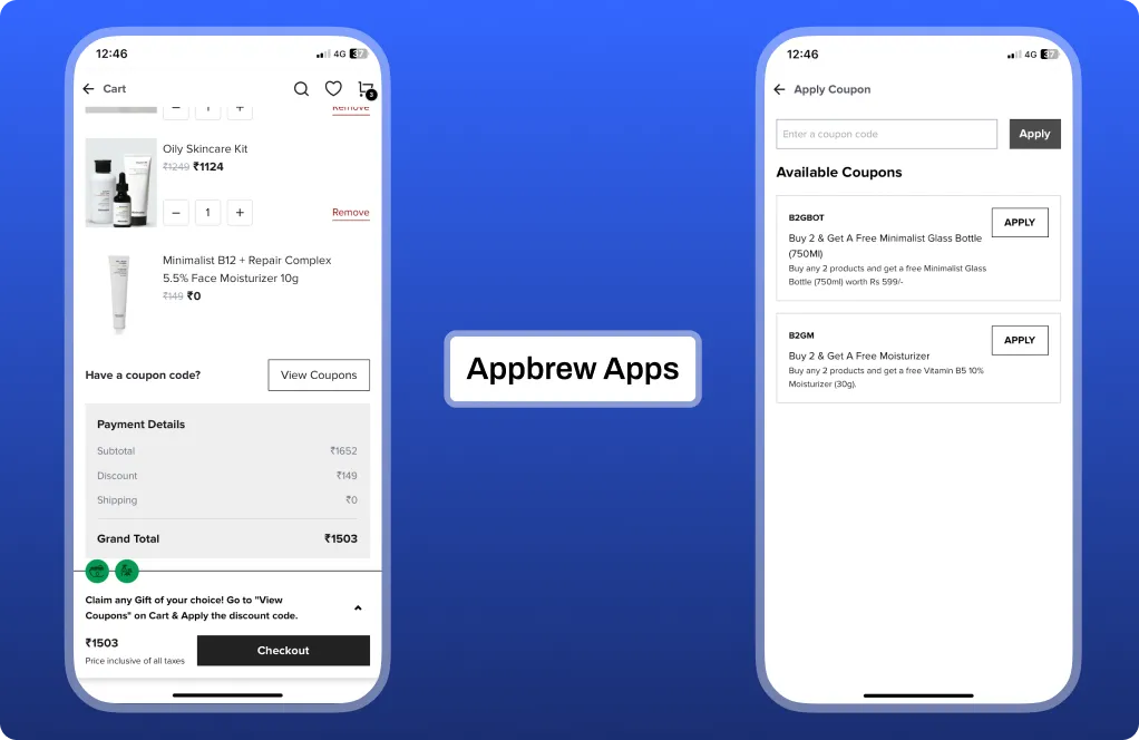 Appbrew's promotion engine works intelligently throughout the shopping journey. Customers see relevant discounts on product pages, receive cart goal prompts during checkout, and get personalized offers based on their shopping behavior and loyalty status.