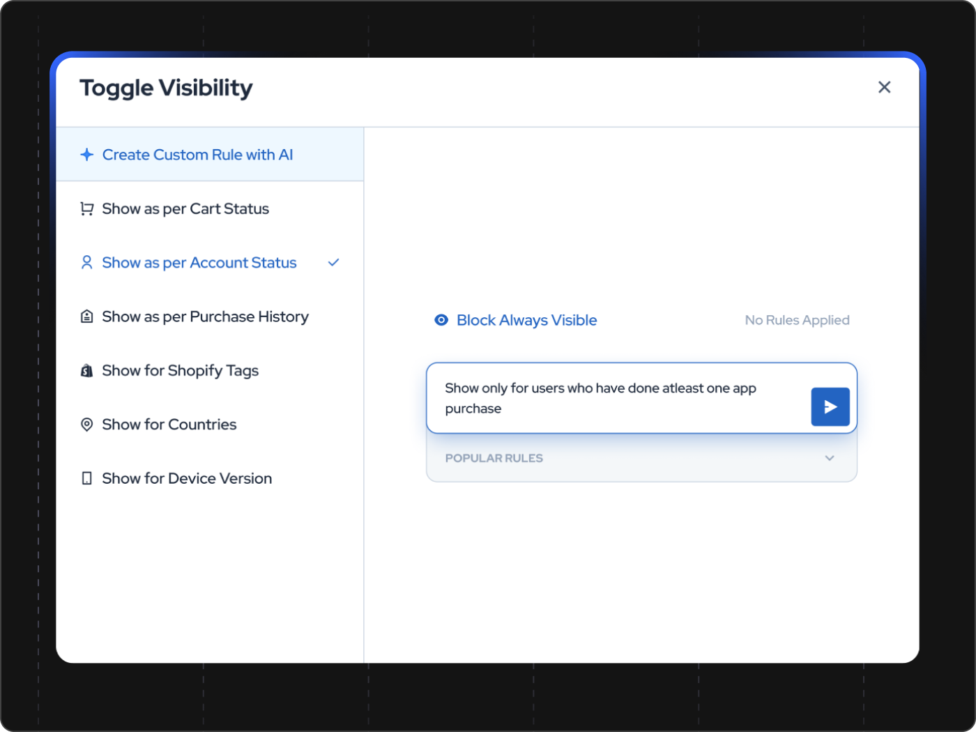 Yes. Appbrew includes Milo, an AI growth assistant that lets marketers build precise targeting and personalization rules without any technical setup. Describe what you want in plain English and Milo translates it into logic using real-time customer data like cart state, purchase behavior, device type, or location, and applies it instantly. No engineering required.